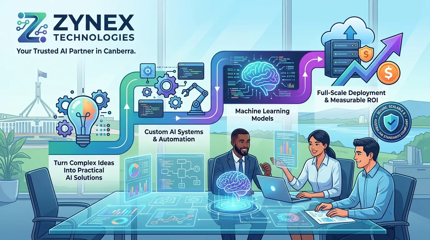 From AI Feasibility Analysis to full deployment, Zynex Technologies helps Canberra organisations build AI solutions that deliver measurable ROI. Strategy to production in weeks, not years.
